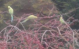 Today three green Rose-ringed Parakeets came from nowhere and landed on the mini-apples tree that sits in front of the bedroom window.